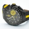Black silicone strap with yellow stripe, Round black ion-plated stainless steel case, 44mm, tachymeter scale at bezel, Black chronograph dial with yellow accents, silver-tone markers, luminous accents, three hands, three subdials, date window and logo, Quartz movement, Water resistant to 50 meters, Two-year limited warranty.