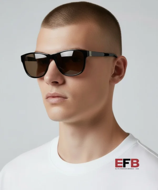 Shape: Square. Lens Width: 57 mm. Lens Bridge: 17 mm. Arm Length: 145 mm. 100% UV protection. Frame Material: Acetate. Frame Color: Black. Lenses Type: Brown. Rim Style: Full-Rim.